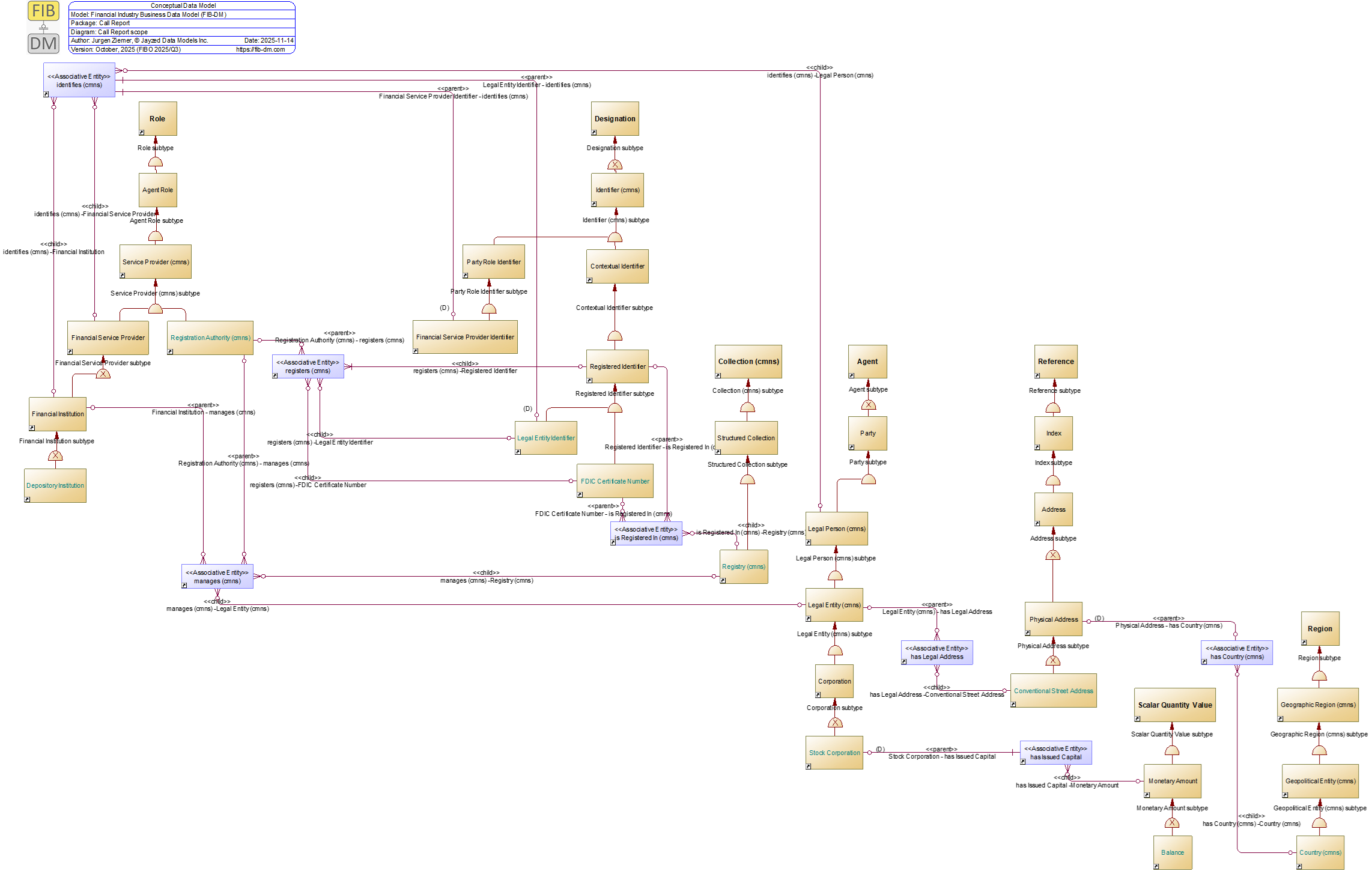 Finally, we replace the sample values with identified FIB-DM entities. Here is our Fundamental Business Concept map for the Call Report Entity Schedule.